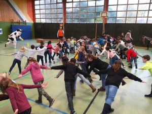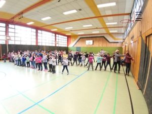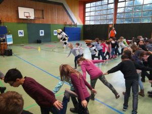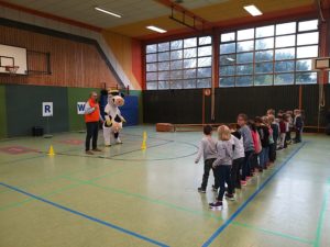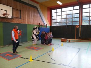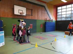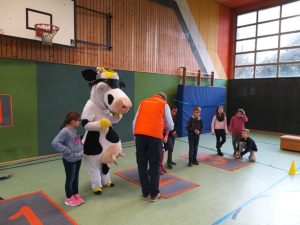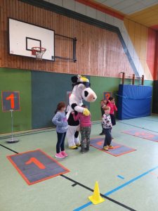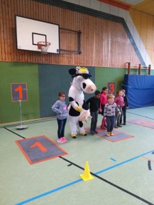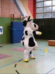 Die Sonnenschule bekam heute besonderen Besuch. Die Kuh Lotte kam mit Verstärkung von der Milchwirtschaft NRW e. V. . Gemeinsam haben sich alle nach Musik bewegt und zusammen ein Quiz gemacht. Anschließend gab es für alle Kinder Milch und für die Klassen Poster zum Nachturnen.