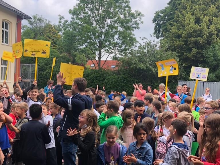 Nach zweijähriger Pause konnte am 09. Juni endlich wieder das Spielfest an der Sonnenschule stattfinden. Es wurden jahrgangsübergreifende Teams erstellt, jedes Team durfte sich einen Teamnamen überlegen und ein Plakat für das Spielfest gestalten. Bei tollem Wetter, einer Verpflegungsstation und vielen spannenden Spielen ging es für die Kinder von Station zu Station. Die Kinder kämpften mit ihrem Team um den Sieg beim Eierlaufen, Sackhüpfen, Seilchenspringen, Torschuss rückwärts, Fliesenrennen, Medizinballweitwurf usw.. Auf den Bildern ist zu erkennen, wie viel Spaß die Kinder an dem Spielefest hatten!