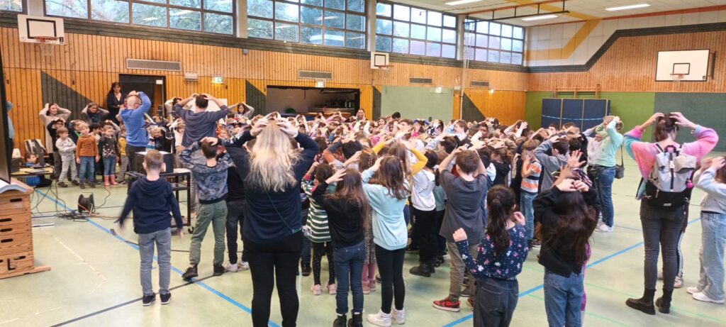 Am Projektag 24.11.2023 haben uns die Minimusiker Till und Jakob besucht und mit uns eine CD aufgenommen. Gestartet hat der Minimusikertag gleich morgens in der ersten Schulstunde. Alle Klassen trafen sich zum gemeinsamen „Warm Up“ in der Turnhalle. Die Minimusiker machten mit den Kindern einige Gesangsübungen und stimmten die Kinder auf die anstehende gemeinsame Liederaufnahme ein.