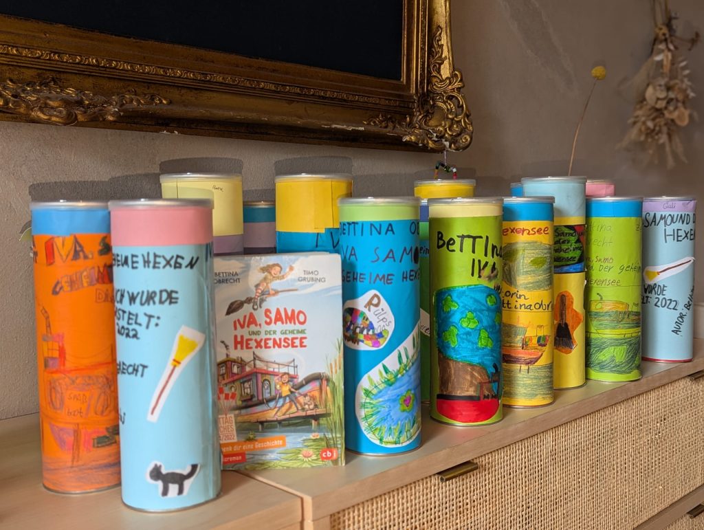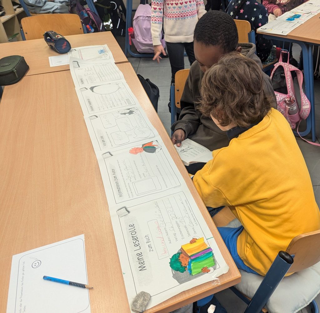 Der vierte Jahrgang hat eine Leserolle zu einem Buch ihrer Wahl angefertigt. In dieser Leserolle werden allgemeine Informationen wie Autor, Erscheinungsjahr und Genre des Buches festgehalten aber auch inhaltliche Elemente. Hier schreiben die Lernenden zu ihrem Leseeindruck, notieren ihre Lieblingsstelle, geben Zusammenfassungen und Beschreibungen zum Gelesenen. Sinn einer Leserolle ist es zum einen die Lesemotivation zu erhöhen und zum anderen das sinnentnehmende und verstehende Lesen zu fördern. Zudem bietet die Erarbeitung der Leserolle viele Lernanlässe (Was ist ein Autor? Was ist ein Verlag? Wie unterscheide ich Wichtiges von Unwichtigem? Wie gestalte ich eine Leserolle für den Leser übersichtlich und ansprechend?…) Für die Schülerinnen und Schüler ist die Leserolle eine gute Möglichkeit Kreativität und Lerninhalte miteinander zu verbinden.