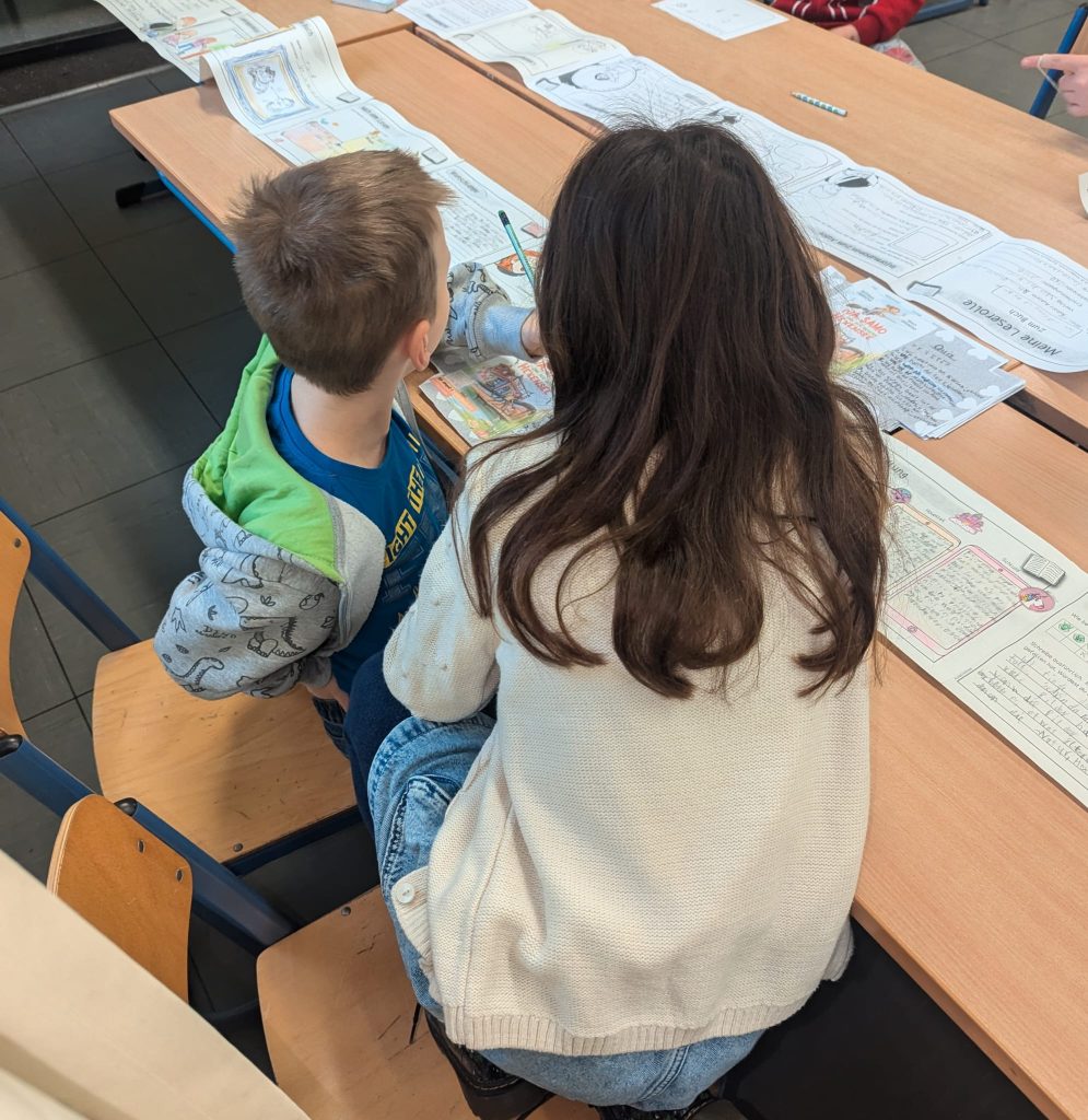 So tolle Leserollen müssen präsentiert und der Öffentlichkeit gezeigt werden! Daher haben die Lernenden mit ihren Klassenlehrerinnen entschieden, ihre Leserollen den Zweitklässlerinnen und Zweitklässlern vorzustellen. Mit großer Aufregung und noch größerer Professionalität haben die Großen den Kleinen ihre Leserollen vorgestellt. Mit Begeisterung und Neugier wurde gelauscht und in die Welt des Buches eingetaucht.
