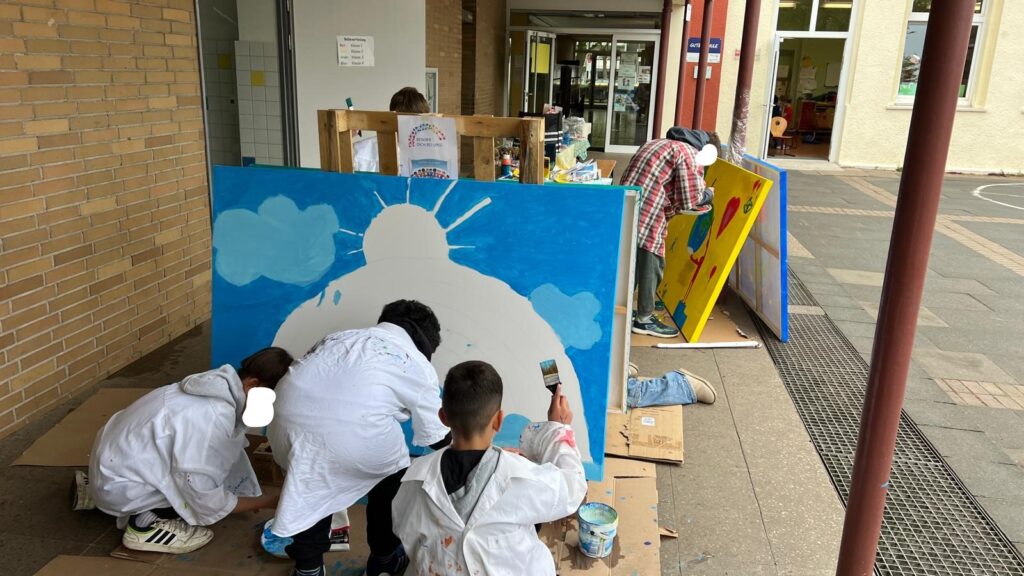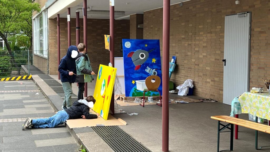In den Osterferien hat Frau Breber mit den Kindern der OGS eine Kreativ-AG angeboten. Kinder unterschiedlichster Jahrgangsstufen haben großformatige Bilder auf Leinwand zum Thema Weltraum und Welt gestaltet.