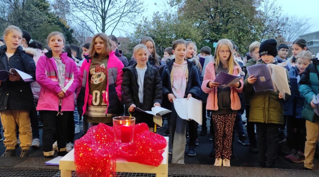 In der Adventszeit treffen sich die Klassen 1 und 2, sowie die Klassen 3 und 4 zum gemeinsamen Adventssingen auf dem Schulhof. Es werden bekannte Weihnachtslieder gesungen, wie „Guten Tag ich bin der Nikolaus“, „Fröhliche Weihnacht überall“, „Rotnasen“, „Kinder tragen ein Licht ins Dunkel“ und „Rudolf hat es eilig“. Einige Kinder begleiten den weihnachtlichen Gesang mit Orff-Instrumenten. Ein paar Fotos und auch ein Video, auf dem die Kinder der 1. und 2. Klassen singen, möchten wir euch nicht vorenthalten.