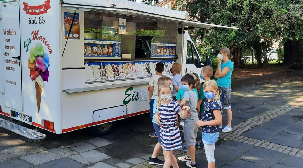 Welche Sorte Eis möchtest du? Schoko, Erdbeer, Oreo und noch viele andere Eissorten hielt der Eiswagen in der letzten Schulwoche für alle Kinder bereit. Die Aktion hat allen Beteiligten super gefallen, sodass auch im nächsten Jahr der Eiswagen wiederkommen wird.