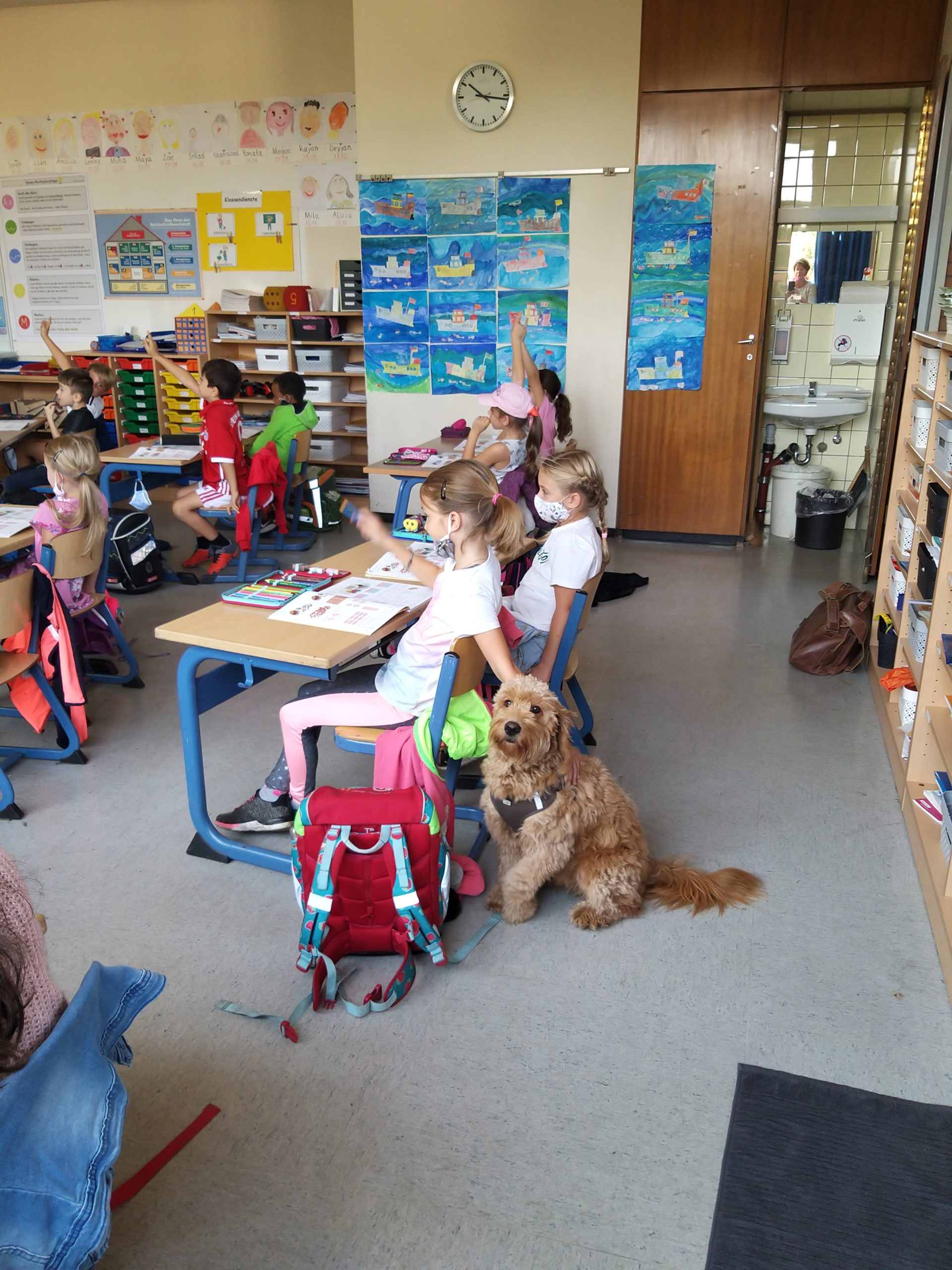 Die Sonnenschule hat Zuwachs bekommen. Schulhund Lucy wird immer mal wieder die Schule besuchen, um sich an die Kinder, Lehrer und Räume zu gewöhnen. Auf dem Foto hat sie die Klasse 2a besucht.