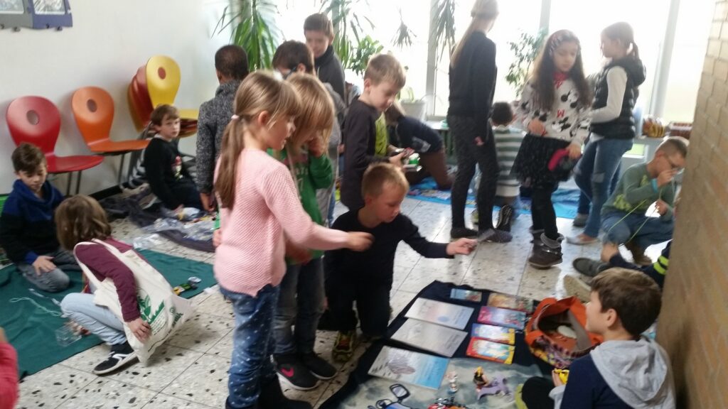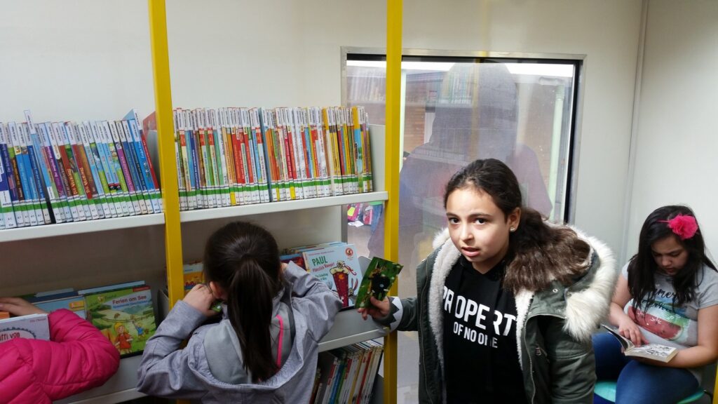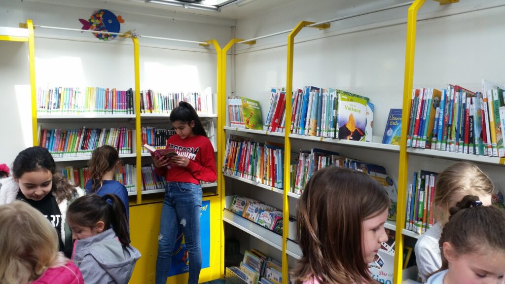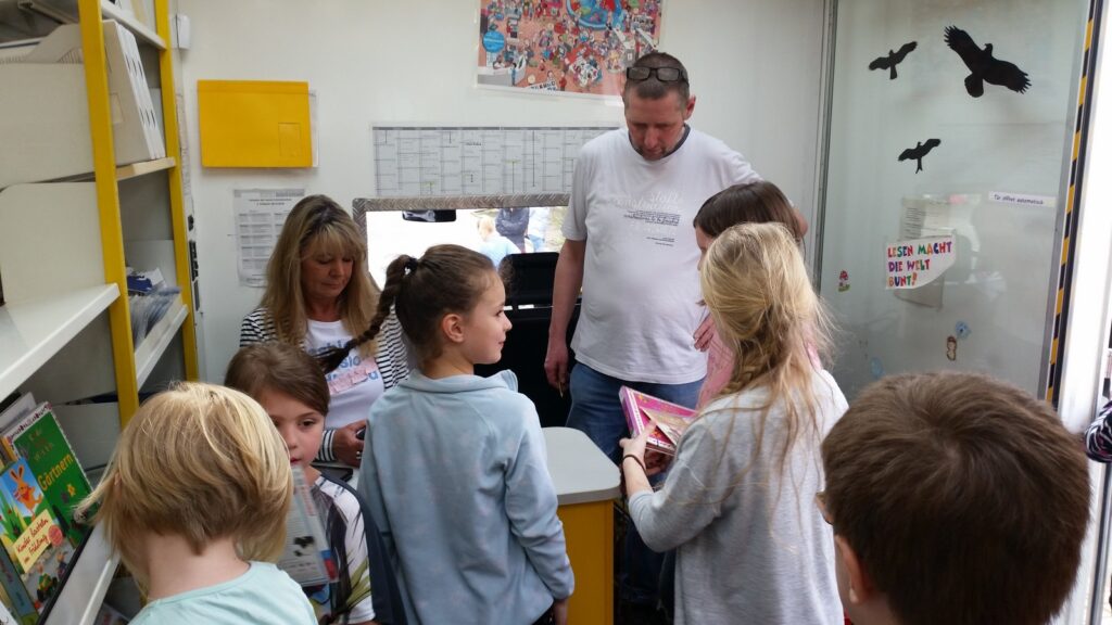 - Ca. alle 14 Tage besucht uns der Bücherbus der Stadtbücherei. Alle Kinder haben die Möglichkeit, sich dort Bücher auszuleihen. Dieses Angebot wird gerne genutzt.