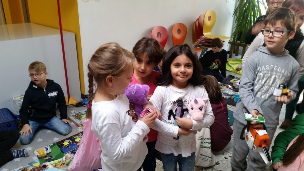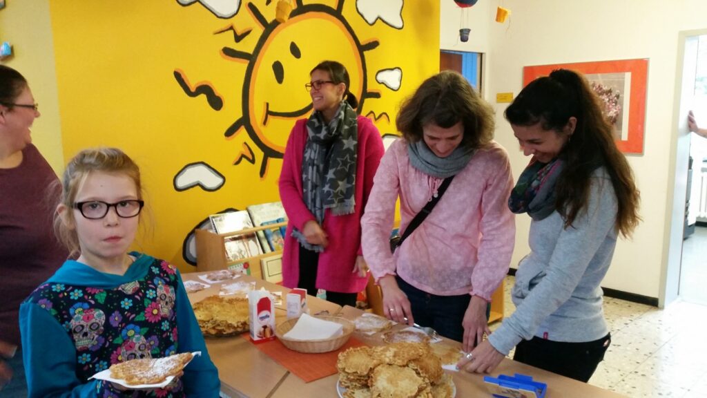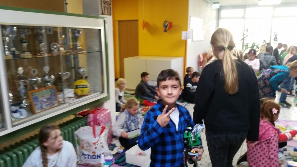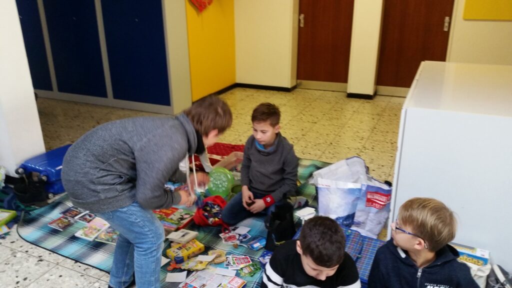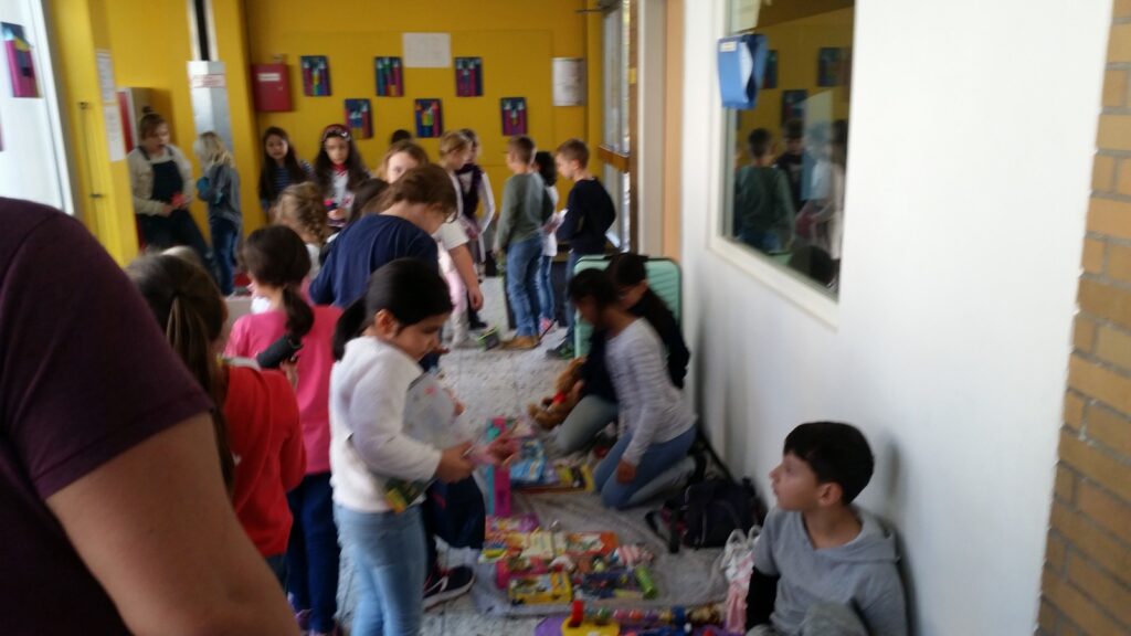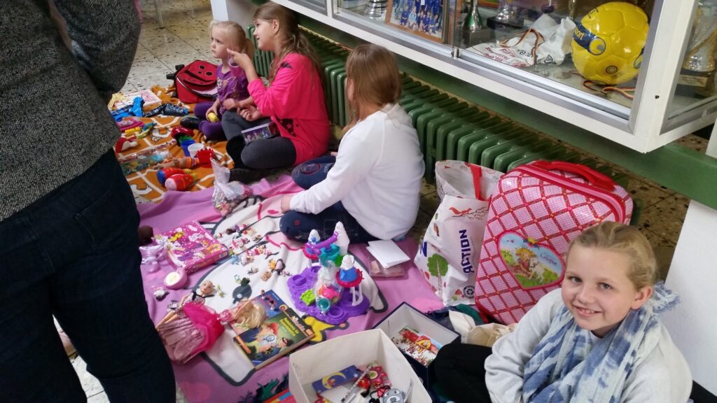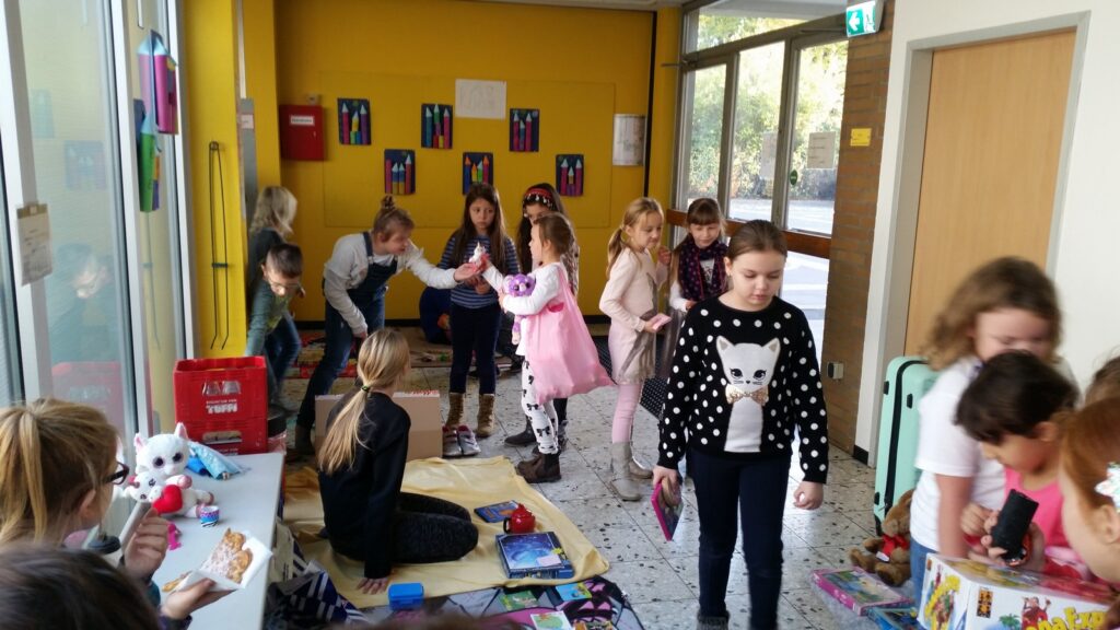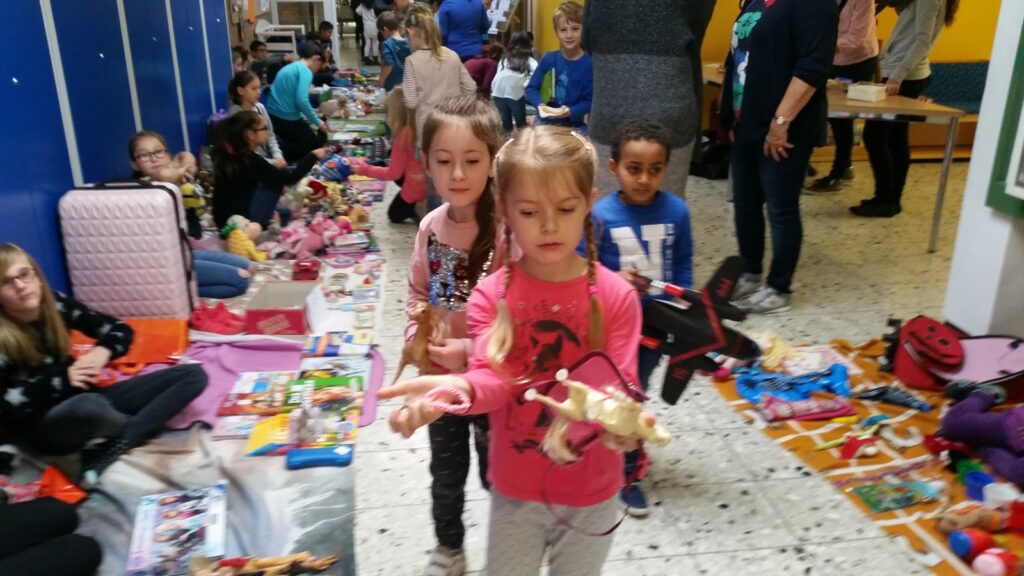 Regelmäßig veranstalten wir auch am Vormittag einen Flohmarkt. Die 3. oder 4. Klassen können gebrauchtes Spielzeug oder Bücher verkaufen, die anderen Klassen dürfen kaufen. Mit Hilfe unseres Förderverins werden dabei auch immer Waffeln verkauft.